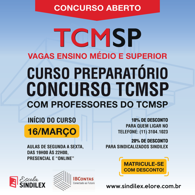 Aproveite esta oportunidade! Curso presencial e online para o Concurso do TCMSP na Escola Sindilex